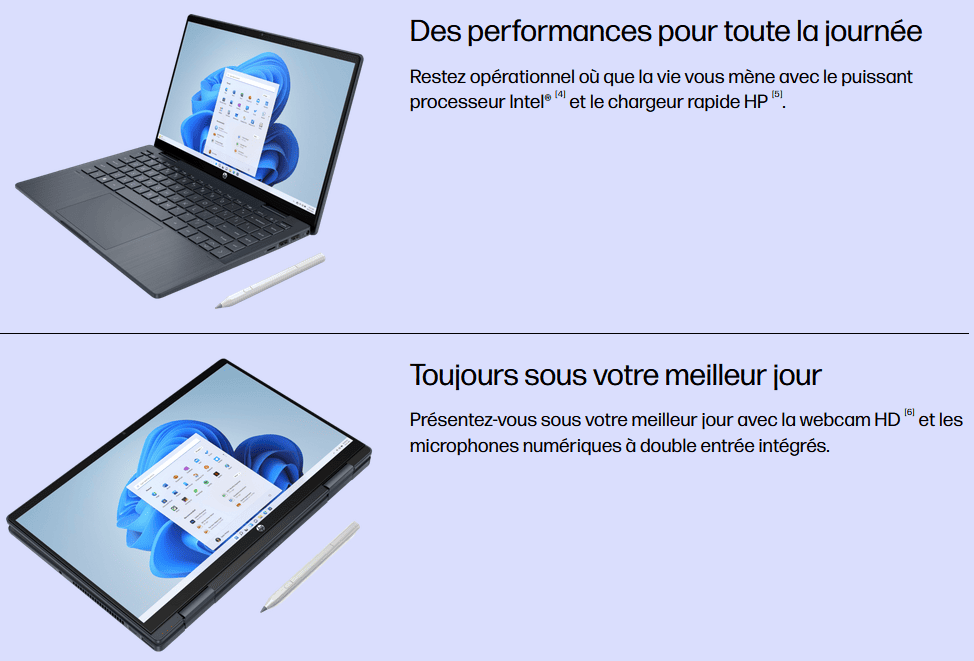 - Caméra HP Wide Vision HD 720p avec réduction temporelle du bruit et microphones numériques à double entrée intégrée