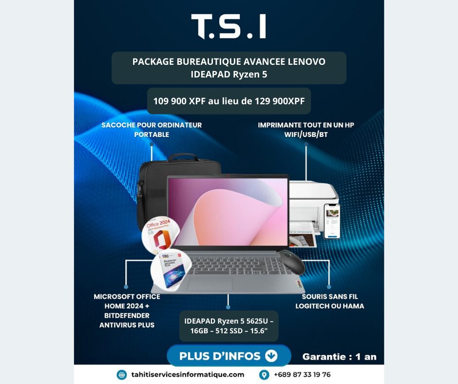 Package bureautique / bureautique avancée Lenovo Ideapad Slim 3 – Ryzen 5 – 16Go RAM – 512 SSD NVMe – 15.6″ FHD